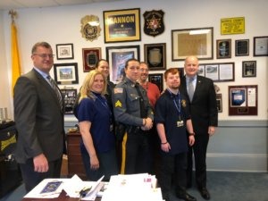 from left: Morris County Sheriff’s Office Undersheriff Mark Spitzer, Morristown High School Training Coordinator Patricia Herbert, Morris County Sheriff’s Office Detective Lt. Denise Thornton, MCSO Training Coordinator Sgt. Walter Rawa, Morristown High School Colonial L.I.F.E. Job Coach Jonathan Mestell, MCSO Intern Kevin Hasenbein, MCSO Sheriff James M. Gannon.