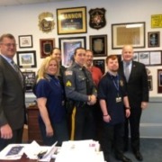 from left: Morris County Sheriff’s Office Undersheriff Mark Spitzer, Morristown High School Training Coordinator Patricia Herbert, Morris County Sheriff’s Office Detective Lt. Denise Thornton, MCSO Training Coordinator Sgt. Walter Rawa, Morristown High School Colonial L.I.F.E. Job Coach Jonathan Mestell, MCSO Intern Kevin Hasenbein, MCSO Sheriff James M. Gannon.